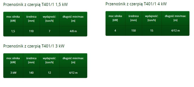 W ofercie dostępne są modele z czerpnią, potocznie zwane zaciągowymi, z koszem zasypowym oraz przenośniki pionowe doskonale spisujące się w zasypywaniu silosów. Przenośniki można wydłużyć aż do 12 mb, ich wydajność jest uzależniona od średnicy danego przenośnika. Dostępne średnice : fi 110 mm, fi 140 mm, fi 150 mm oraz fi 250 mm. Przenośniki za dodatkową opłatą można wyposażyć w podstawy jezdne 2 lub 4 kołowe.